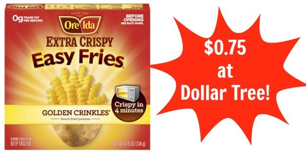 Ore-Ida Easy Fries, Only $0.50 at Dollar Tree! - The Krazy Coupon Lady There is a new $1.00/2 Ore-Ida Frozen Potato Products coupon from today's Smart Source insert. This coupon has no size restrictions. Use it at Dollar Tree and score two boxes of Ore-Ida Easy Fries for just $0.50 each!