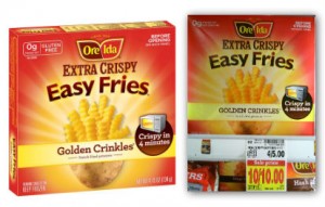 Ore-Ida Coupon: Fries or Tater Tots ONLY $0.50 at Kroger! Ore-Ida Microwavable Extra Crispy Easy Fries and Easy Tater Tots are just $1, so just $0.50 each after your coupon! Ore-Ida Microwavable Extra Crispy Easy Fries (4.75 oz) or Easy Tater Tots (5 oz) - $1.00 (thru 10/15) Buy 2, Use $1/2 Ore-Ida Potato Product from 08/25 RP (exp 10/6)